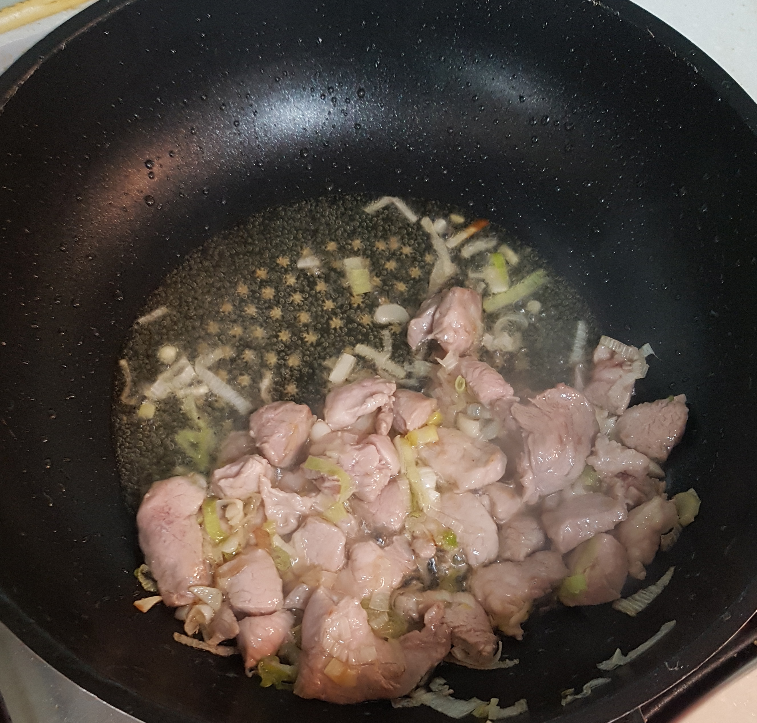 파가 충분히 볶아졌으면 준비한 돼지고기를 넣고 한 번 더 볶아주세요