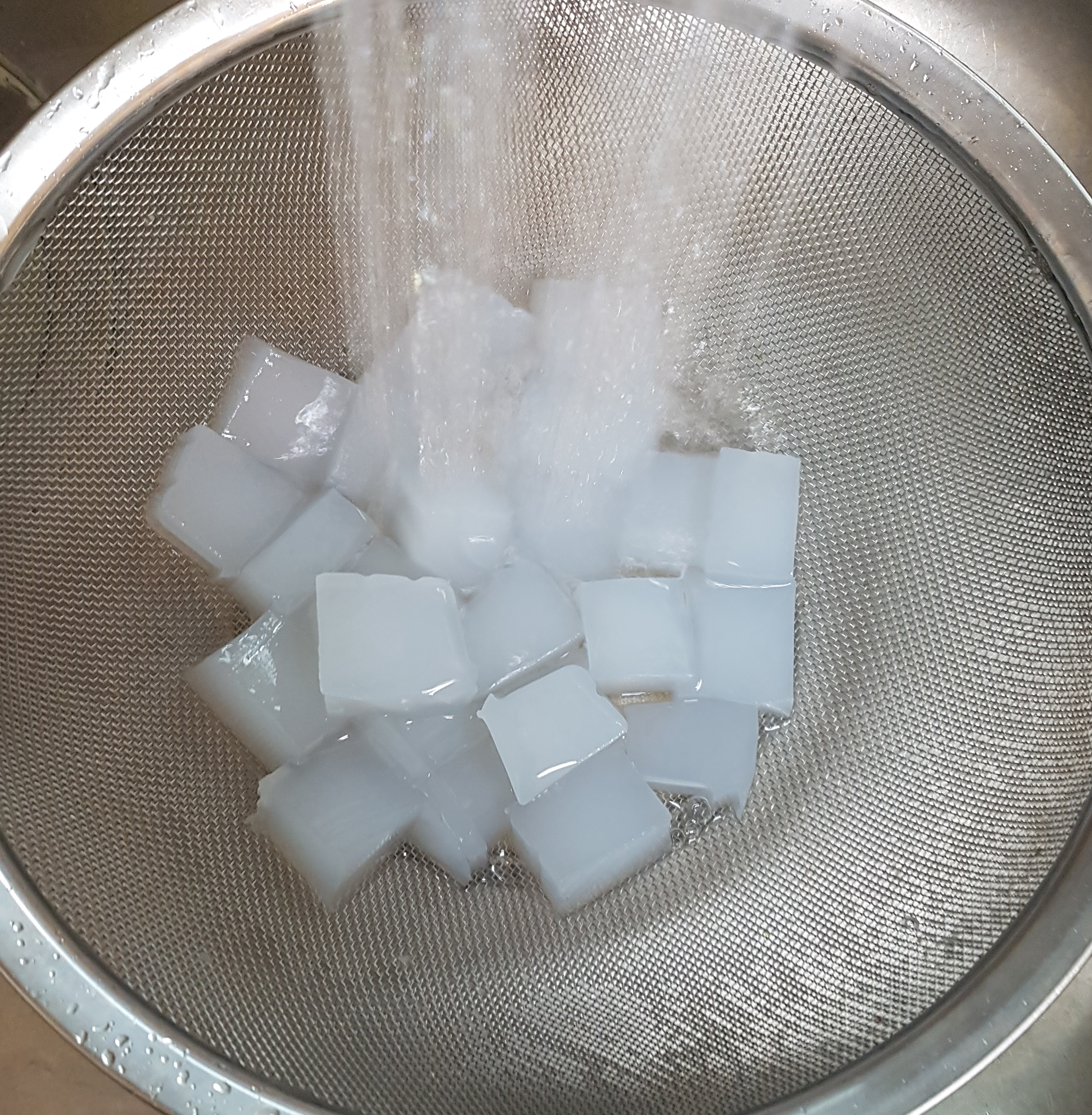2~3분 정도 데쳐준 청포묵은 건져내어 찬물에 헹궈주신 후 물기를 제거해주세요