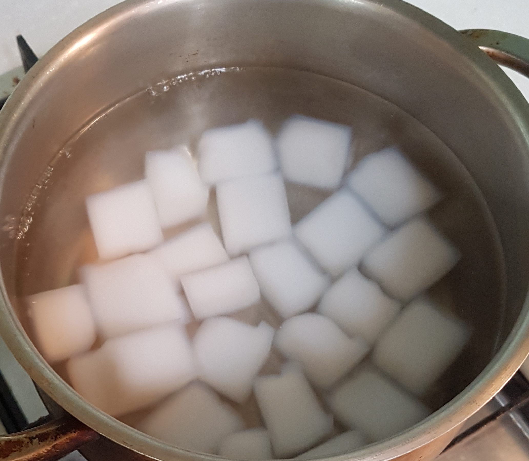 그리고 물이 끓기 시작하면 먹기 좋은 크기로 잘라준 청포묵을 넣고 2~3분 정도 데쳐주세요