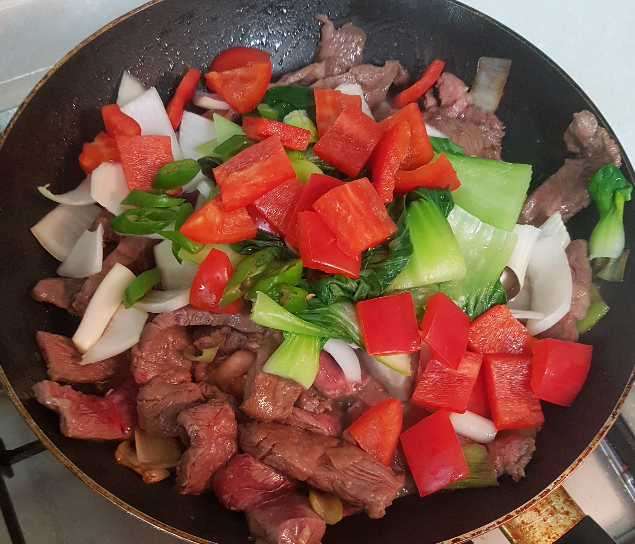 등심을 2분 정도 볶아주었으면 준비한 양파, 빨강 파프리카, 청양고추, 청경채, 표고버섯을 넣고 추가로 2분 정도 더 볶아주세요
