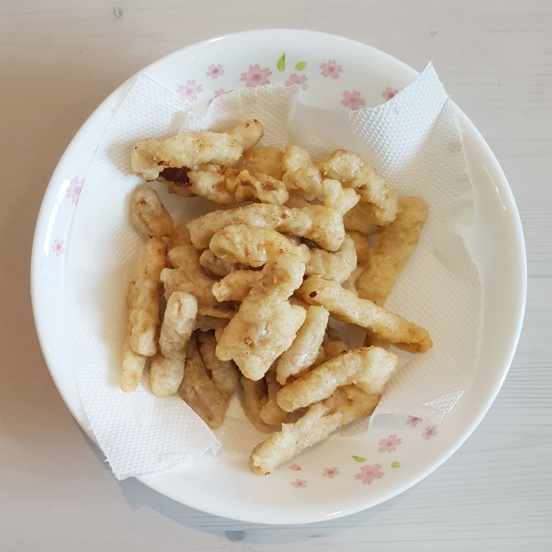 그리고 1분 정도 추가로 튀겨준 탕수육도 똑같이 건져내 주신 다음에 키친타월 등에 올려주어 기름을 빼주세요